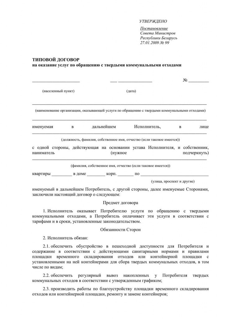 Типовой договор на оказание данной услуги утвержден постановлением Совета Министров Республики Беларусь от 27.01.2009 года № 99. Данный вид договора в соответствии с Законом от 16 июля 2008 г. № 405-3 «О защите прав потребителей жилищно-коммунальных услуг» является публичным, в этой связи, независимо от факта его заключения, плата за данную основную жилищно-коммунальную услугу начисляется и предъявляется к оплате.